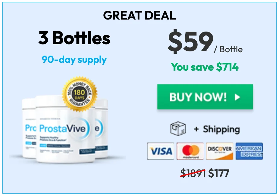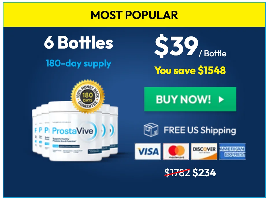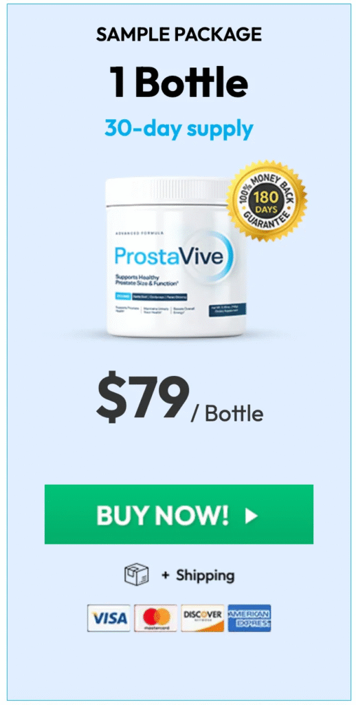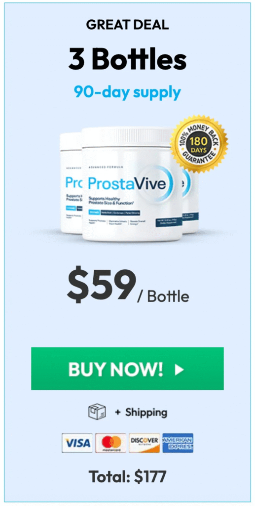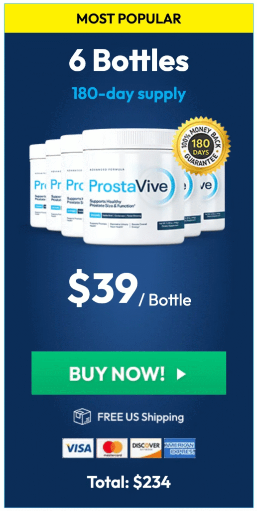 To protect your health and ensure you’re getting the authentic formula, we strongly recommend purchasing ProstaVive only through the Official Website. This guarantees you’re receiving the real product, manufactured under strict quality standards and backed by a 180-day money-back guarantee.