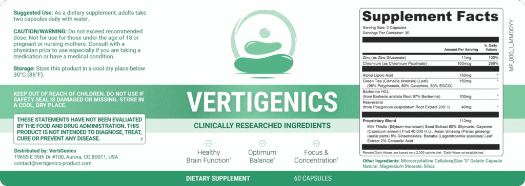 Vertigenics is a dietary supplement formulated with natural ingredients like Berberine HCL, Chromium, Alpha Lipoic Acid, and Green Tea Leaf to support metabolic health, blood sugar regulation, and overall wellness.